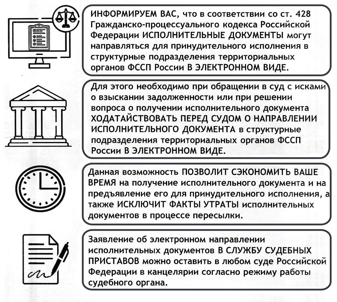 | Информация о возможности направления исполнительных документов в электронном виде | версия для печати |